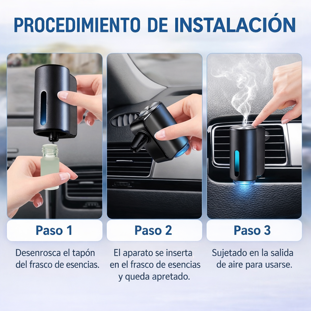 En pocos pasos podrás disfrutar de un ambiente fresco en tu auto. Solo prepara la esencia, ajusta el difusor y colócalo en la salida de aire. En segundos quedará listo para funcionar de forma automática.